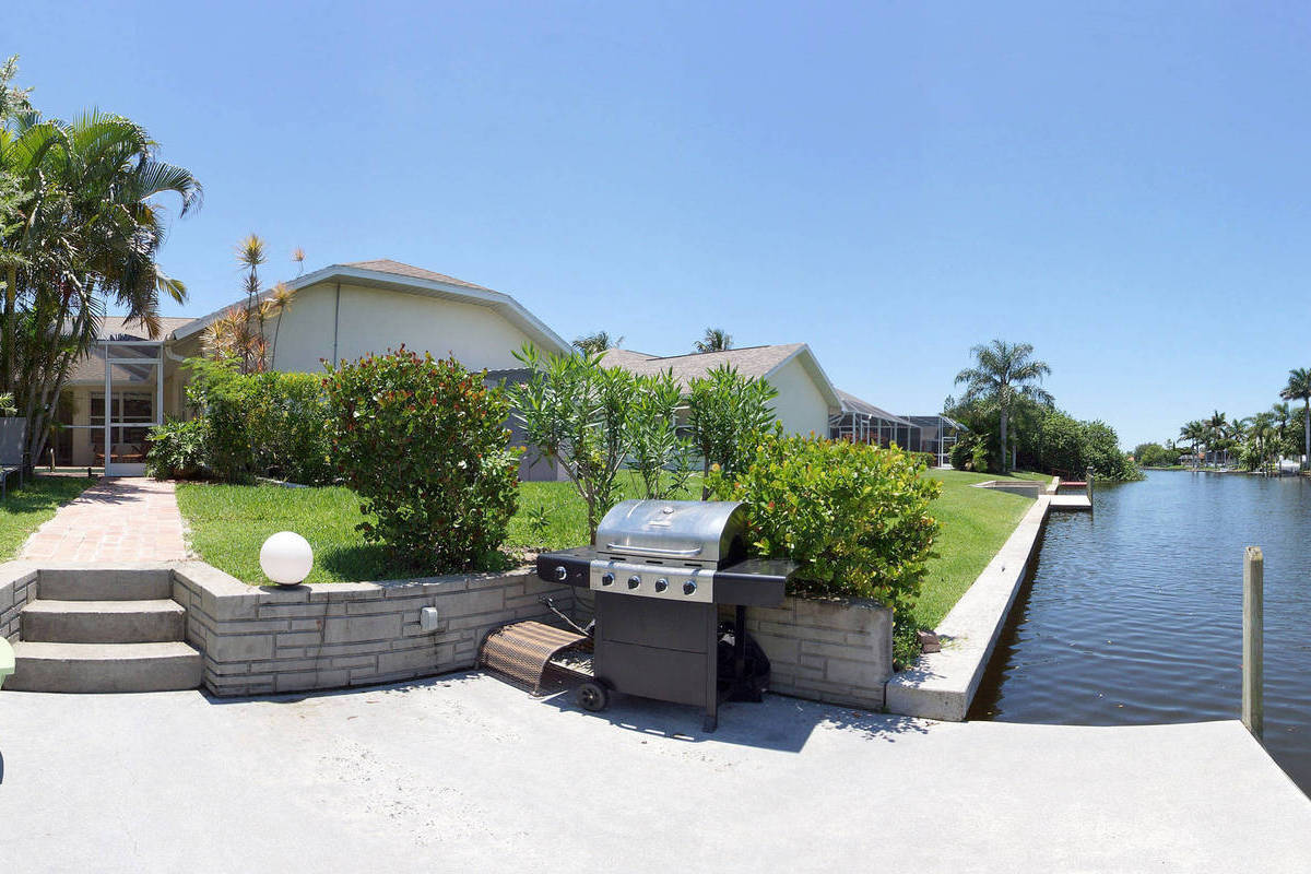 Im Hauswirtschaftsraum stehen Waschmaschine und Trockner. Das Tor der großen Garage ist elektrisch bedienbar, die Garage hat direkten Zugang zum Haus. Der Aussenbereich besteht aus einer grosszügigen überdachten Terrasse, einem Pool, sowie 6 Stühlen, 2 Tischen und 4 bequemen Sonnenliegen. Dieser Bereich ist aus Schutz vor Stechmücken & Insekten komplett mit einem Netz (Screen) überzogen. Der große Gasgrill steht direkt auf dem Bootsdeck am Kanal.